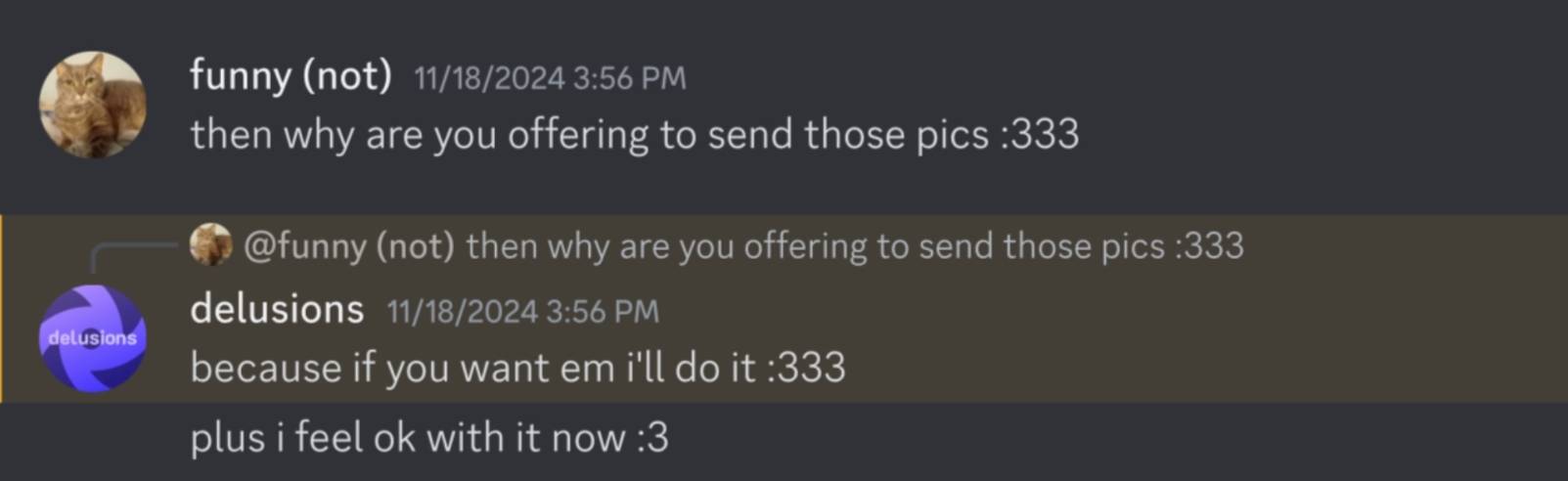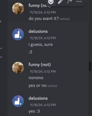 Turns out, delu forgot about the time where SHE asked ME for nsfw FIRST and she didnt delete the messages. I just took some ss, give me a moment to send then i took them on a shitty kindle fire