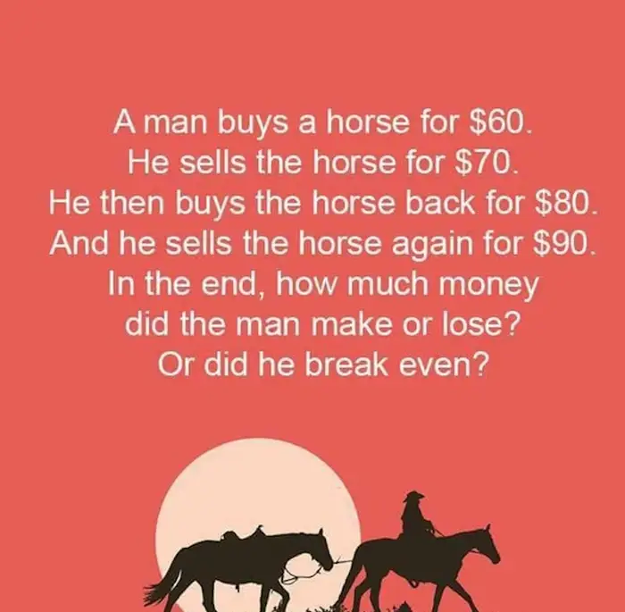 He then buys the horse back for $80. And he sells the horse again for $90. In the end, how much money did the man make or lose?