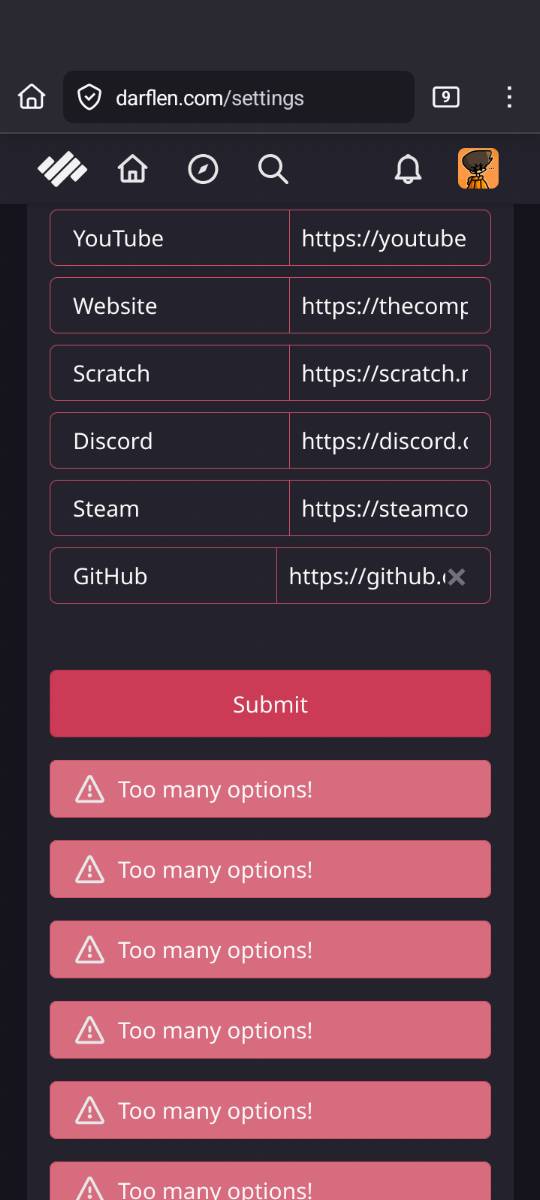 I think I found a new glitch in Darflen: The site (correctly) prevents you from adding any more links after the fifth one... unless you reload the page. Then the "Add new link" button shows up again.